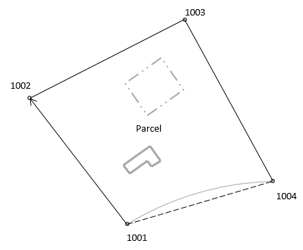 A crew surveyed the exterior of a parcel, Figure J-23. They assumed the coordinates of the southernmost corner (1001) and used the record bearing for the southwesterly line (1001-1002)
