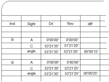 The value of the reverse angle is the difference between the FS and BS readings. The direct and reverse angle should be close. Their difference should be primarily due to instrumental and pointing errors. The difference is recorded in the diff column. |