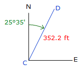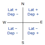 Sin(0°) to Sin(90°) ranges from 0 to +1.0 Cos(0°) to Cos(90°) ranges from +1.0 to 0 The correct mathematical sign for the Lat and Dep come from the bearing quadrant. A bearing of S 47°35' E has a negative Lat (South) and a positive Dep (East). |