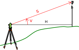 Some measurements we may think are direct are in fact indirect. One example is horizontal distance measurement with a total station. Usually all we do is sight a reflector, press a button, and the instrument reports the horizontal distance. But the instrument doesn't directly measure a horizontal distance even when its Line of Sight is horizontal. A total station measures slope distance and vertical angle, Figure B-6, and uses them to compute the horizontal distance.
