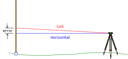 On an adjusted instrument which is correctly set up, the LoS should be horizontal and perpendicular to the instrument's VA. A non-horizontal LoS means the instrument has a collimation error. A LoS that is inclined or depressed from horizontal, Figure F-5, introduces a rod reading error.
