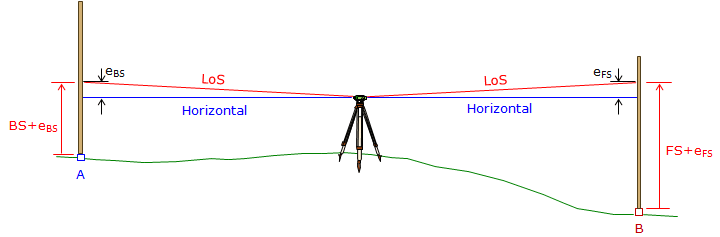 Because collimation error cancels if BS and FS distances are balanced, checking for it purposely uses unbalanced sight distances. The elevation difference between two points is determined using a short BS / long FS condition followed by a long BS / short FS condition. If there is a collimation error, the two elevation differences will not be the same.