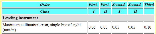 While these are control-level standards, they can serve as a guide for local applications. Local project control might use Third (or possibly Second) Order specifications while that for topographic control would be looser. Regardless, the error in an instrument is not known unless a collimation check is performed.