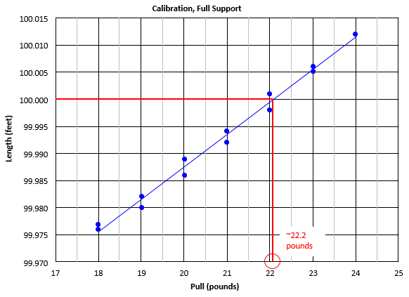 For a heavy tape, the length may not reach 100.00 ft under a reasonable amount of pull. In the case of the calibration data in Figure C-7, at 28 pounds of pull the tape is still about 0.022 feet short of 100.00 feet. How much pull would be needed to reach 100.00 ft? No doubt more than practically possible in the field.