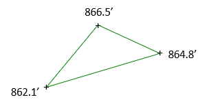 Starting with the two highlighted southern points, the 864 ft and 866 ft contour lines pass somewhere between them. Since a uniform slope is assumed, 864 ft and 866 ft would cross at proportional distances between the data points.