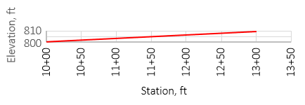 The table is one way to look at the data, plotting it is another way to visualize it. Using the same scale for both axes, Figure I-2, results in a very flat plot that is difficult to interpret. That's because elevation changes only 9.0 ft while stationing changes 300 ft, a 1:33.33 ratio.