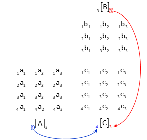 For example, multiplying 4[A]3 by 3[B]3 to obtain 4[C]3, elements of the [C] matrix are: