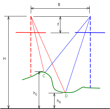 If we can measure the parallax of both points, we can determine one point's elevation based on the other, Equation F-7.