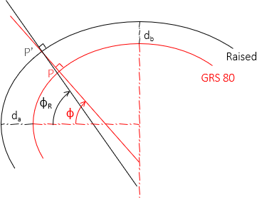 OK, so the ellipsoid geometry is maintained but a new problem appears: the normal to the GRS 80 ellipsoid is not normal to the raised ellipsoid, Figure M-6.