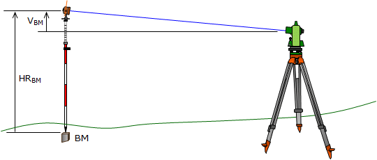 The TSI is set up at a location from which a reference elevation or benchmark (BM) is visible. The vertical distance is measured to a reflector held on the BM, Figure F-6.